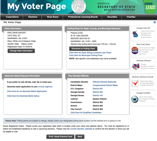 Fill in the MVP login section on the right and click “Submit”. This will take you to the following page. The text items that are colored blue-grey are actually buttons you can click. For example, if you want to apply for an absentee ballot, you can click on the words “Click here for an absentee ballot application” in the lower left part of the screen. If you have had an absentee ballot during this election cycle, you can check whether you will receive on for the run-off by clicking on “Click here for Absentee Ballot status”.