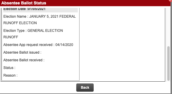 There may be more information in this window that you can only see by scrolling down using the grey scroll bar on the right side to see the information below. These windows show that I had an absentee ballot for the general election (11/03/2020) and they have received a request for absentee ballots for both the State Runoff (12/01/2020) and the Federal Runoff (01/03/2020) elections. (You may have had an automatic request entered for you if you already had an absentee ballot for the November general election.)